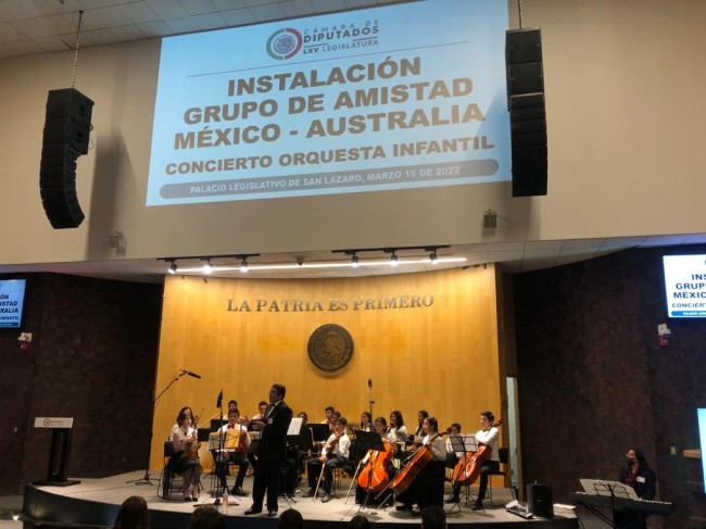 23 de marzo, 2022. Como parte de la ceremonia de instalación del Grupo de Amistad México - Australia, la Cámara de Diputados dio espacio a la presentación de la Orquesta de Niños y Jóvenes Educados en el Hogar (ONJEH), una orquesta compuesta por niños de diferentes estados de la República Mexicana que realizan sus estudios en casa (home school).